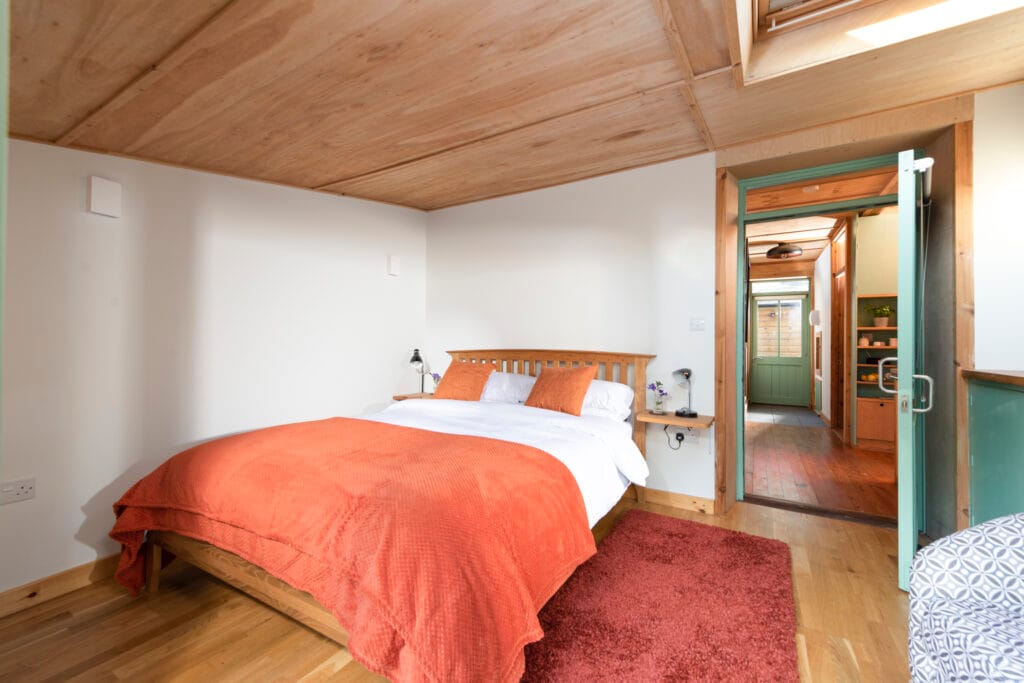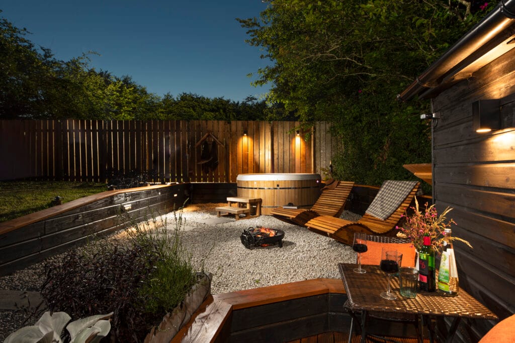 The bedroom, with its sumptuous king-size bed and garden views, opens directly onto the patio and sunken hot tub — perfect for stargazing under North Devon’s dark skies. Dogs are welcome too (though please note the garden isn’t fully enclosed and sheep graze nearby).
